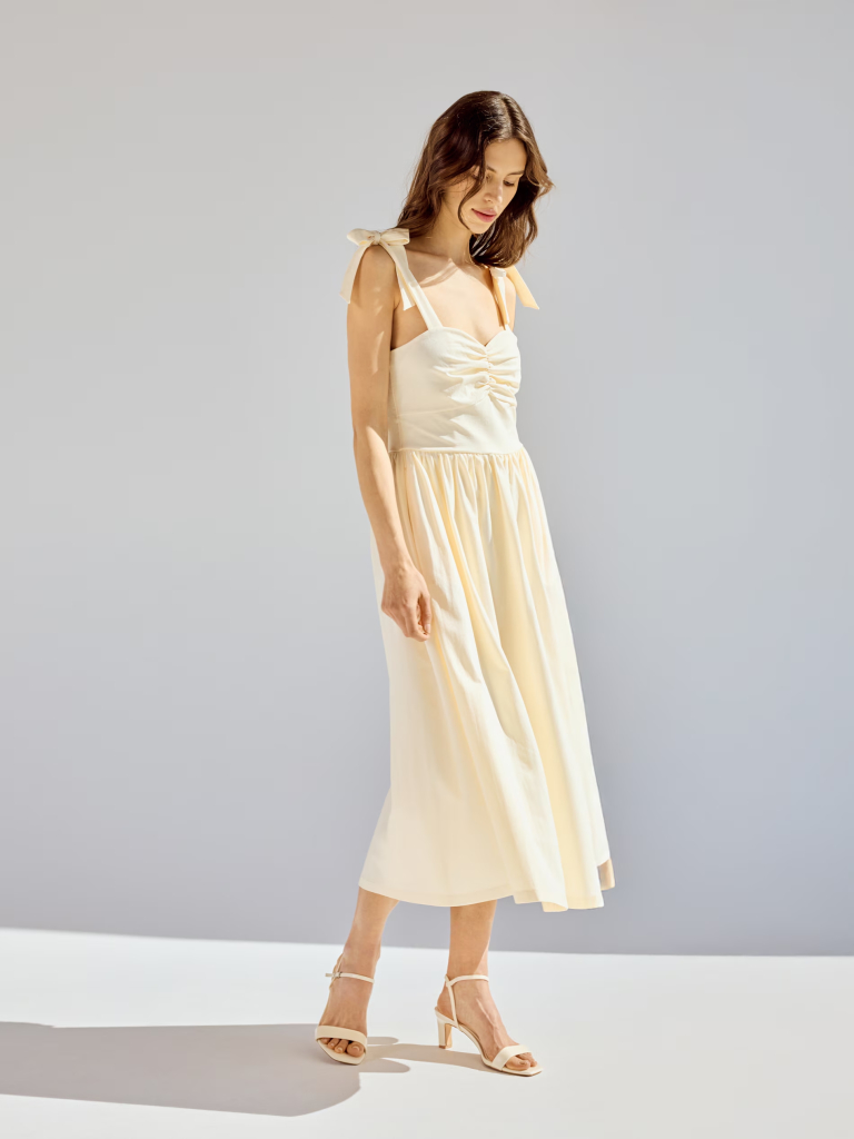 Ezt az egyszerű, pasztell színű ruhácskát a dekoltázs ráncolása és a vállpántok masnija teszi különlegessé. Bájos, letisztult, mégis romantikus és kidolgozott benyomást kelt, éppen ezért imádjuk annyira.