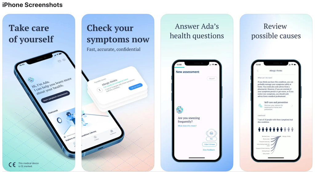Az Ada app egy orvosi tudásbázissal rendelkező virtuális asszisztens. Ha tüneteid vannak, elmondod neki, és kérdéseken keresztül végigvezet, majd egy listát ad lehetséges okokról. Az app nem diagnosztizál, de segít eldönteni, hogy orvoshoz kell-e fordulni. Olvass még a témában