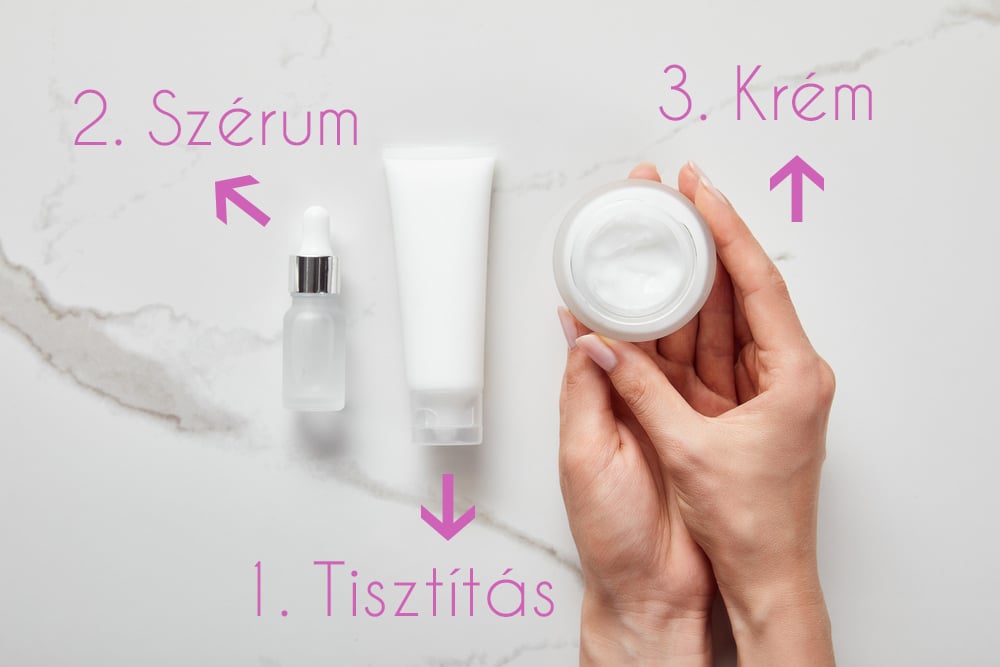 Első a tisztítás – ezt ugye sosem hagyjuk ki -, utána jöhet a szérum és végül a krém.