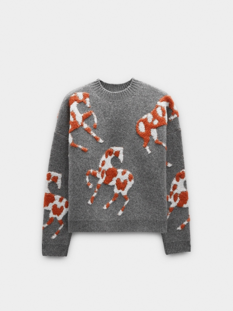 A mintás darabok mindig feldobják a szürke hétköznapokat – ez a lovas jacquard pulcsi pedig játékos, mégis elegáns. Szoknyával és farmerrel is tökéletes választás.