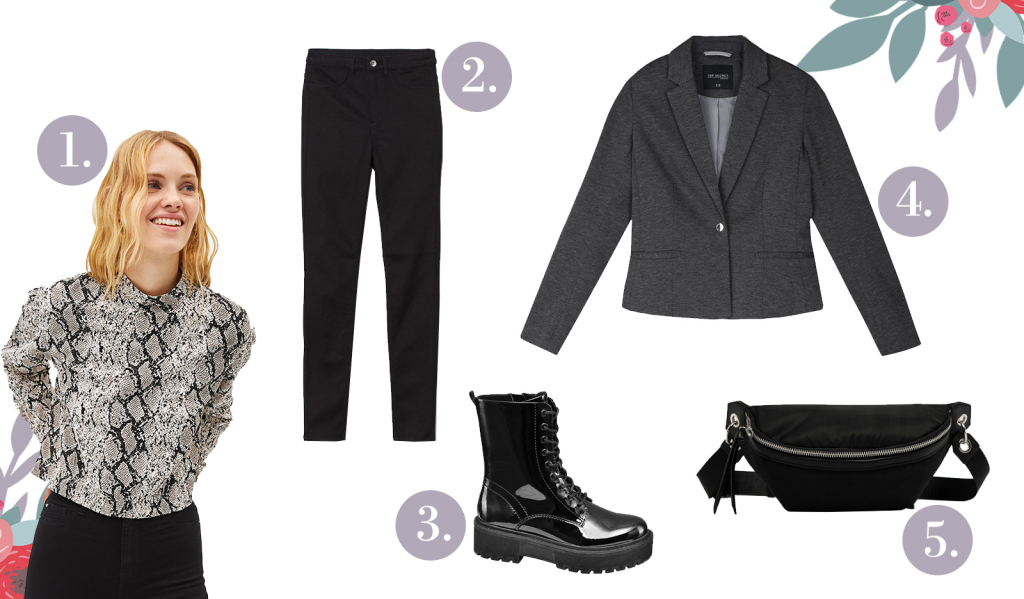 A kígyómintás ruhák – szemben a leopárdmintával –, sokszor inkább a hidegebb színeket részesítik előnyben. Nincs ez másként ennél a szép blúznál sem, ami a szürkés-ezüstöt árnyalatokat ötvözi a feketével. A felső kidolgozása szerencsére eleve kellően szolid, hiszen enyhén ejtett fazonú, valamint zárt szabású, úgyhogy nem kell aggódnod amiatt, hogy közönséges hatást kelt. Feltűnő mintája miatt azonban ezt a felsőt is javasolt szolidabb alappal, tehát inkább fekete-szürke kiegészítőkkel viselned. A bővebb szabás miatt nyugodtan viselj hozzá egy skinny farmert, valamint lehetőség szerint emelt derekú fazon válassz – ez nem csak az aktuális trendek miatt jó ötlet, hanem azért is, mert a blúz is kicsit rövidebb szabással rendelkezik. A szettet nagyon jól kihangsúlyozza egy platformos bakancs, valamint egy fiatalos, trendi övtáska. Az i-re a pontot egy maszkulin hatású blézer teszi fel!