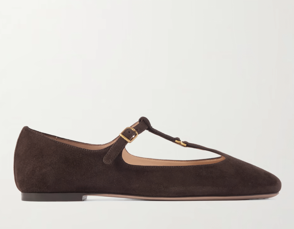 A Chloé balerina finoman idézi a márka ikonikus „Marcie” táskáját, aranyszínű csatdíszével és elegáns T-pántjával. Puha velúrból készült, a pántnak köszönhetően pedig tökéletesen a lábfejhez igazítható. Lenge ruhákkal és elegáns nadrágkosztümökkel egyaránt stílusos, kifinomult hatást kelt.