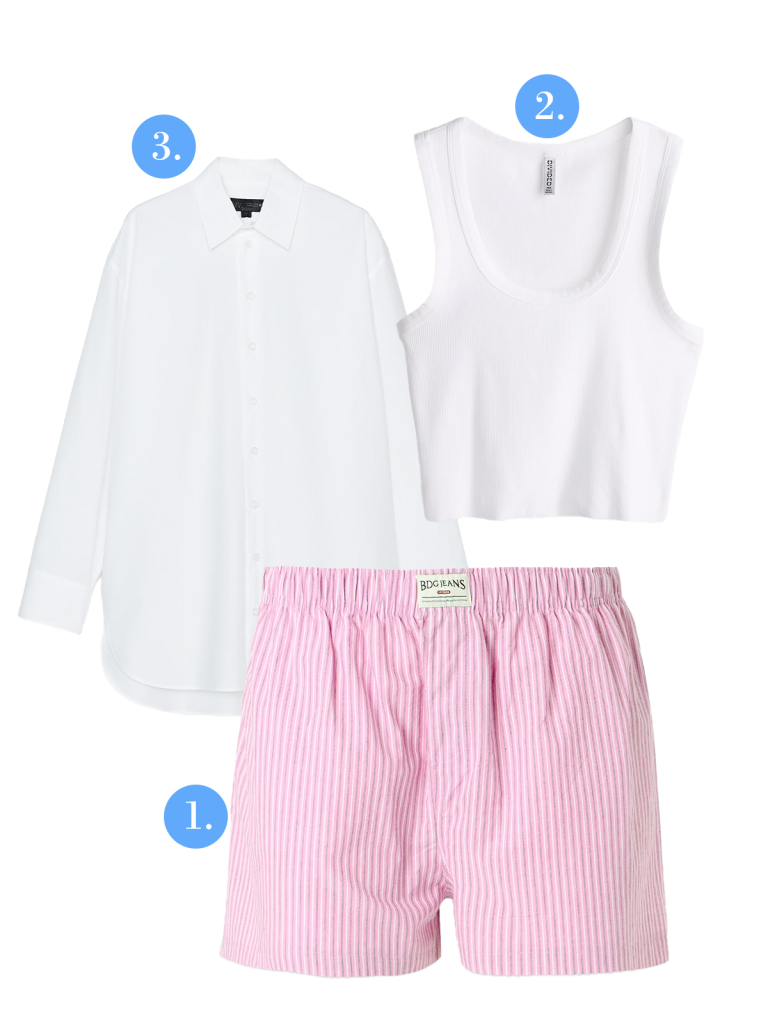 Képzeld el, amint egy kora délutáni napsütésben sétálsz a városban, és ezt a rózsaszín csíkos boxer nadrágot viseled felette egy egyszerű, fehér trikóval, miközben a válladra egy lenge, hófehér ing omlik. A pasztell és fehér árnyalatok játéka frissességet kölcsönöz, a laza rétegezés pedig elegáns nőiességgel fűszerez, még akkor is, ha a hőmérő már 35 fokot mutat. Ez a szett épp olyan, mintha a hálószoba nyugalmát vinnéd magaddal a forróságba, miközben garantáltan stílusos maradsz.