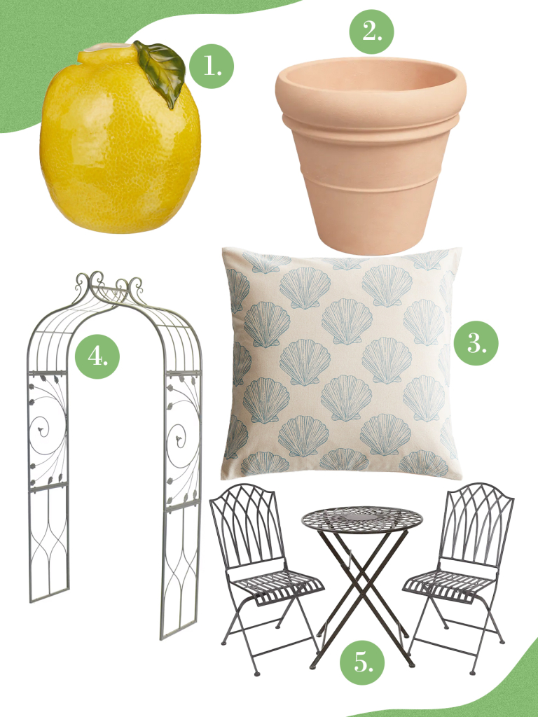 Az elmúlt években mindenhol lehet kapni citromos kiegészítőket a párnáktól kezdve a vázákig bármit megtalálhatsz – ezek pedig remekül passzolnak a mediterrán hangulathoz. Emellett az élénk kék árnyalatok, illetve a kovácsoltvas (pl. rózsalugas vagy bútorok formájában) és terrakotta dekorációk, kaspók sem hiányozhatnak egy dél-európai stílusú kertből.