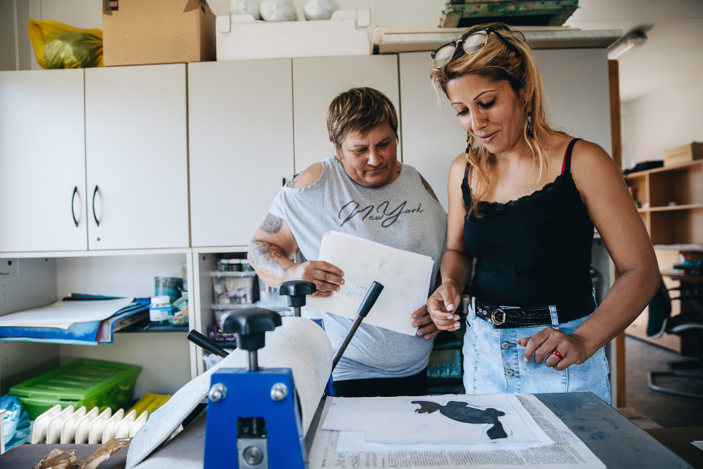 Társadalmi vállalkozásunkban jelenleg Toldról 6 főt foglalkoztunk teljes állásban, emellett többen kapcsolódnak hozzánk alkalmi munkavállalóként. Hárman a kézműves műhelyben a termékek gyártásáért felelnek: fa- és textiltermékekre festik, hímzik a gyerekrajzos motívumokat, és egyre több terméken megjelenik a kézi linónyomat is. Tanítjuk nekik a varrást is, de egyelőre Toldon még csak az egyszerűbb termékeket tudják varrógéppel varrni, így alkalmazunk olyan nyugdíjas vagy megváltozott munkaképességű varrónőket is, akik képesek az összetettebb termékek varrására is.
