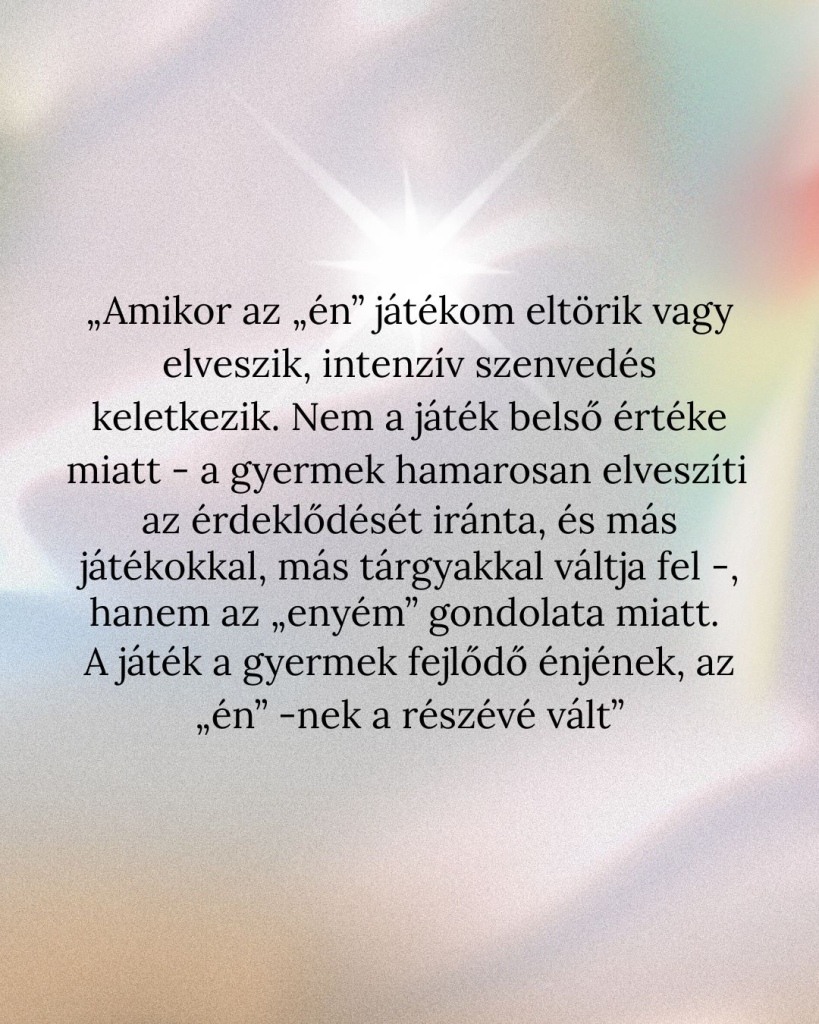 „Amikor az „én” játékom eltörik vagy elveszik, intenzív szenvedés keletkezik. Nem a játék belső értéke miatt – a gyermek hamarosan elveszíti az érdeklődését iránta, és más játékokkal, más tárgyakkal váltja fel -, hanem az „enyém” gondolata miatt. A játék a gyermek fejlődő énjének, az „én” -nek a részévé vált”