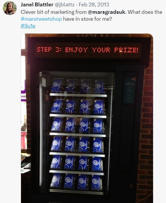2013-ban a MARS kihelyezett egy automatát az angliai Durham Egyetemen és létrehozták a #MarsTweetShop-ot. A diákoknak be kellett követnie a Twitteren a @marsgradsuk oldalt, ahol tweet-elniük kellett egy egyedi kódon keresztül, ami tartalmazta a MarsTweetShop hashtaget. Ezután csak be kellett gyűjteniük a jutalmat, amit az automata adott nekik. Ez valamilyen csokoládé, cukor vagy állateledel volt brandelt dobozokban, amely egy kedves üzenetet is tartalmazott. Ezzel elindították a beszélgetést a diákok körében a MARS-ról, nem csak mind termékekről, de a Twitter oldal bekövetésével és az egyetemen kihelyezett szórólapok segítségével mint munkahelyről is.
