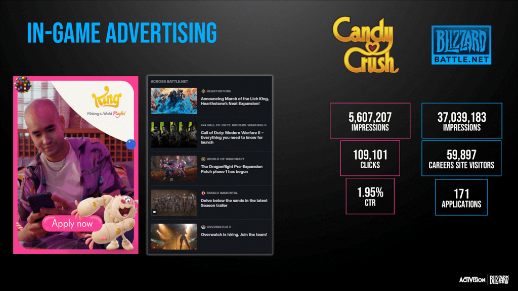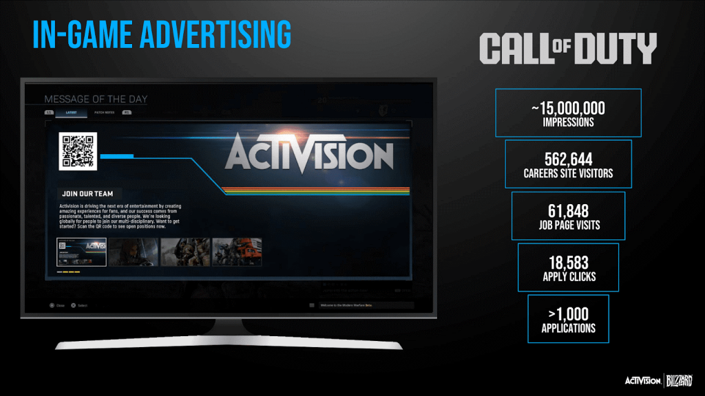 Az Activision Blizzard hatalmas aduászt játszott ki, amikor fogyasztóira potenciális munkavállalóként tekintett. Egy olyan egyszerű lépéssel, mint hogy elkezdték hirdetni magukat munkavállalóként a játékokban 52%-kal nőtt meg karrieroldaluk látogatottsága, és 40%-kal a jelentkezők száma. Ez 1000 jelentkezőt jelentett, amivel teljesítették a 2022-es toborzási tervet.