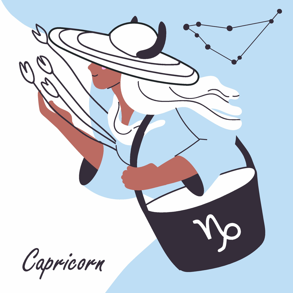 Capricorn girl, zodiac sign. Charming woman in a hat, carrying a bag, horoscope avatar with cosmic astrological constellation. Trendy girl, astrology character. Flat vector illustration , hand drawn.