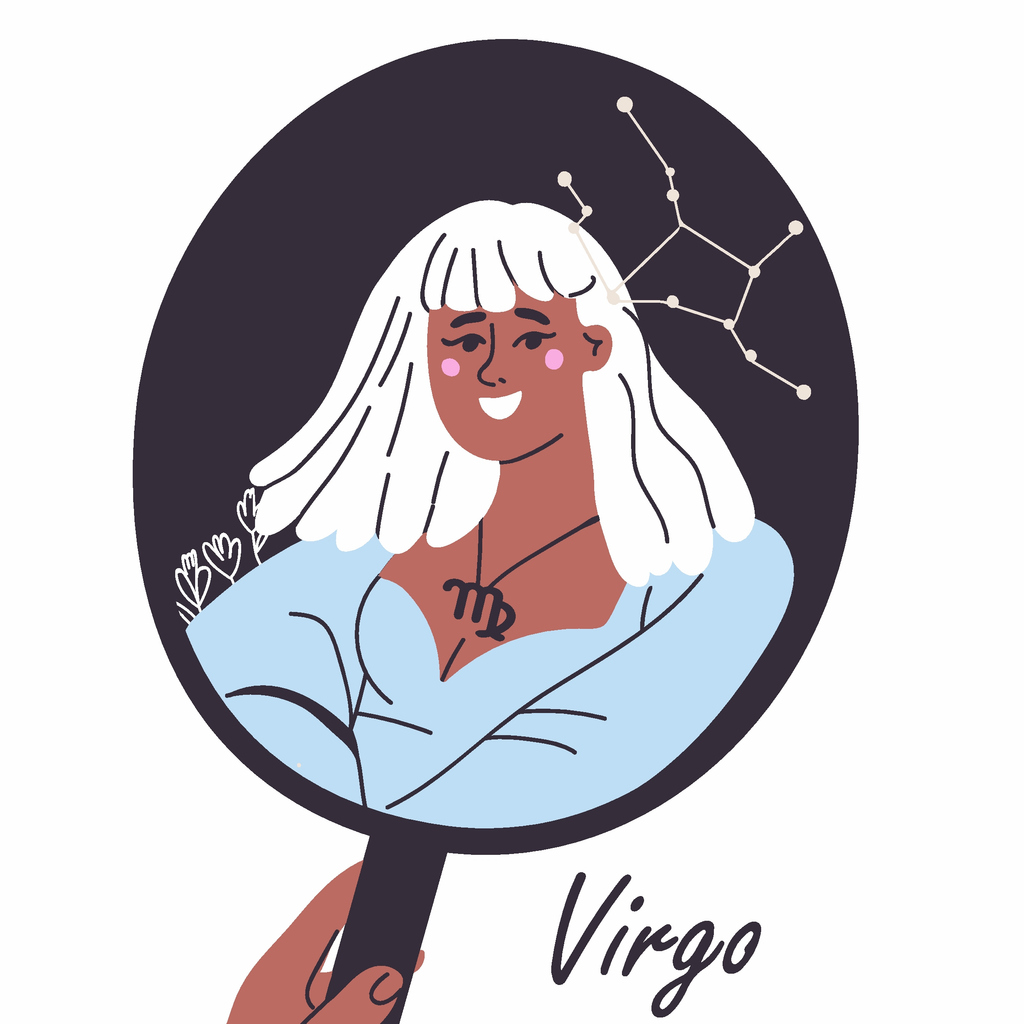 Virgo woman, zodiac sign. Modern stylish female character, astrological horoscope avatar. Beautiful person reflected in a mirror, looking at herself. Girl astrologer. Flat graphic vector illustration, hand drawn.