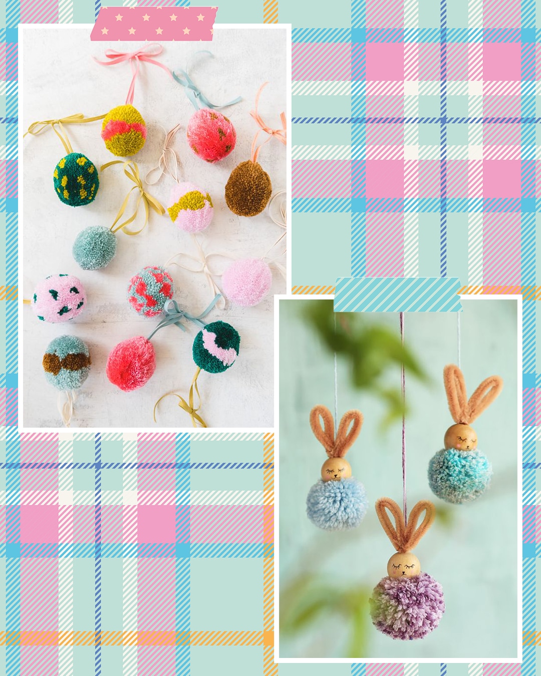 A színes pomponok egyszerűen elkészíthetőek és minden évszakban szuper díszeket készíthetsz belőlük. Például aranyos, pihe-puha nyuszis koszorút, amin több kis tapsifüles kap helyet. Két nagy füllel kiegészítve pedig egy nagyobb, egyszerűbb díszt is készíthetsz. Erre kerülhet még egy szép szalag is, amivel fel tudod majd akasztani a kész koszorút. A pomponok elkészítéséhez fonalra lesz szükség, a többi dekorációhoz pedig filc anyagra, kicsi pomponokra és mozgó szemekre (ezeket papírból vagy filcből is elkészítheted).
