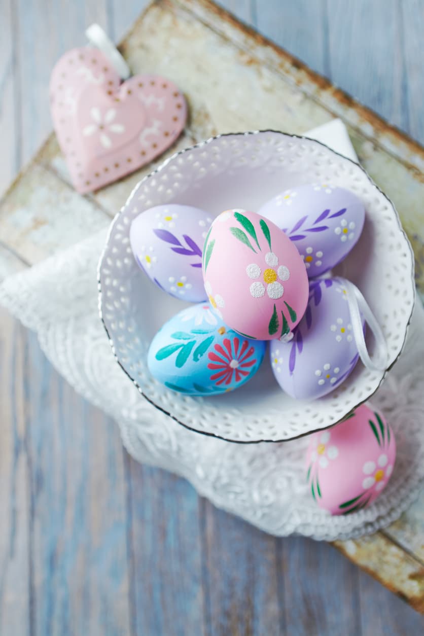 Ha tavasz, akkor halvány „tejszínes” pasztell színek! Fesd halványrózsaszínre, bézsre és világoskékre a tojásokat, majd akrill festékkel pingálj rá egyszerű virágmotívumokat!