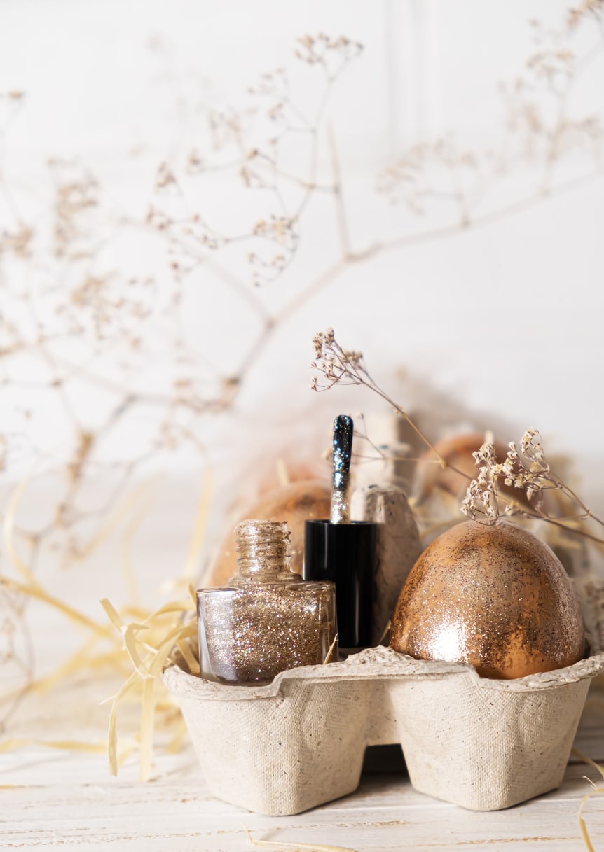 Akár a festett, akár a natúr színű tojásokat átfestheted egy klassz csillámos körömlakkal. Különleges csajos hatást érhetsz el például, ha a rózsaszínűre festett tojásokat még egy rose gold csillámos lakkal átfuttatod.