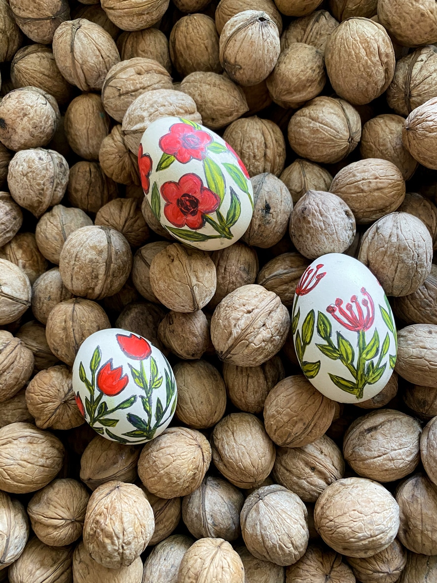 Ha a hagyományos, magyaros motívumok híve vagy, festhetsz akrill festékkel bármilyen piros virágos mintát! A legszebb, ha előzőleg a tojásokat fehér festékbe mártva átfested.