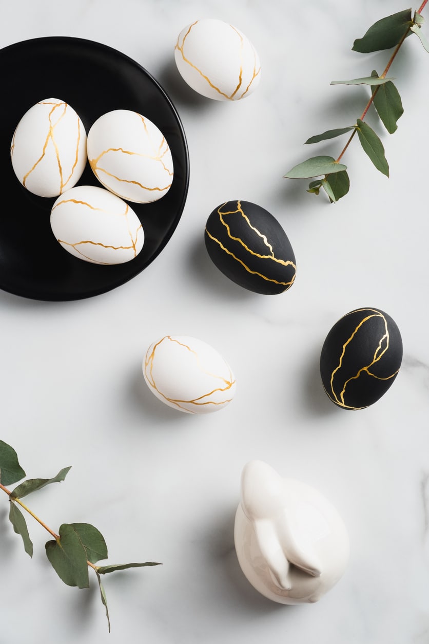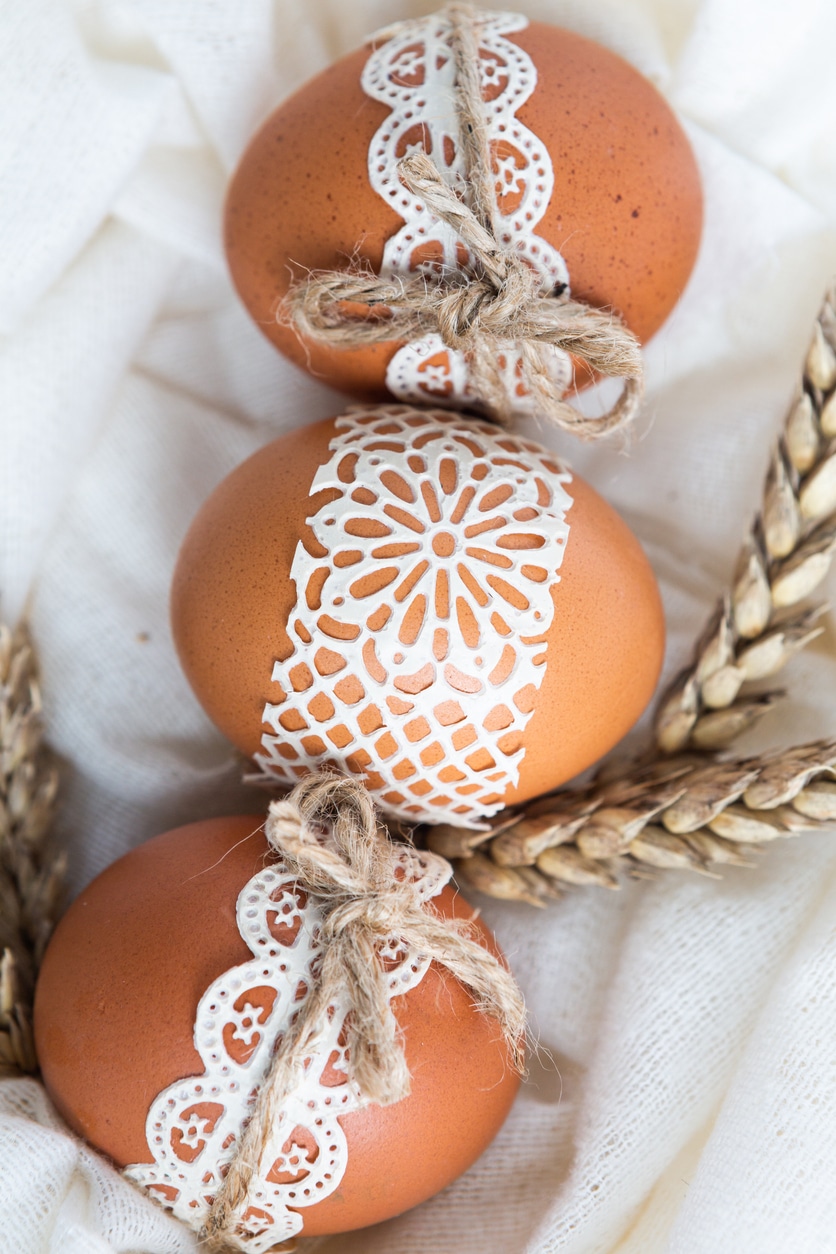 Csipkés papírterítőkből kivághatsz néhány csipke csíkot, amit aztán ragasztóval a natúr színű tojásokra illeszthetsz.