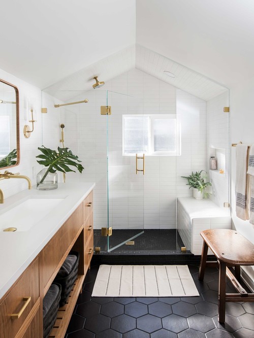 Ha egyedibb hangulatú fürdőszobára vágysz, a fekete burkolat is szuper választás lehet. Jól mutat fehérrel kombinálva a kontrasztos hatásért - és pont, mint a divatban, a lakberendezési trendek esetében sem kell attól tartanod, hogy elavult hatást keltene. Érdemes játszanod a csempék elhelyezésével annak függvényében, mennyire szeretnél modern és letisztult hatást elérni. Jól passzolnak a feketéhez az arany csaptelepek és ajtógombok is, illetve ha nem szeretnél túlságosan sötét hatást elérni, akkor csak a padlót is burkolhatod fekete lapokkal.