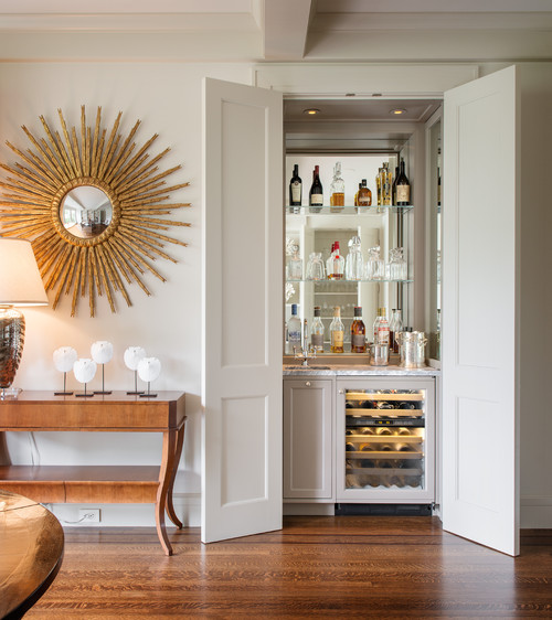 A bárokat nem csak a nappali, vagy éppen az étkező közvetlen közelében helyezhetitek el sőt, nem is kell, hogy ezek a hasznos kiegészítők látszódjanak. Mivel a bárok nem csak akkorák lehetnek, hogy mindannyian körbe tudjátok ülni őket, akár egy beépített „szekrényben” is helyet kaphatnak