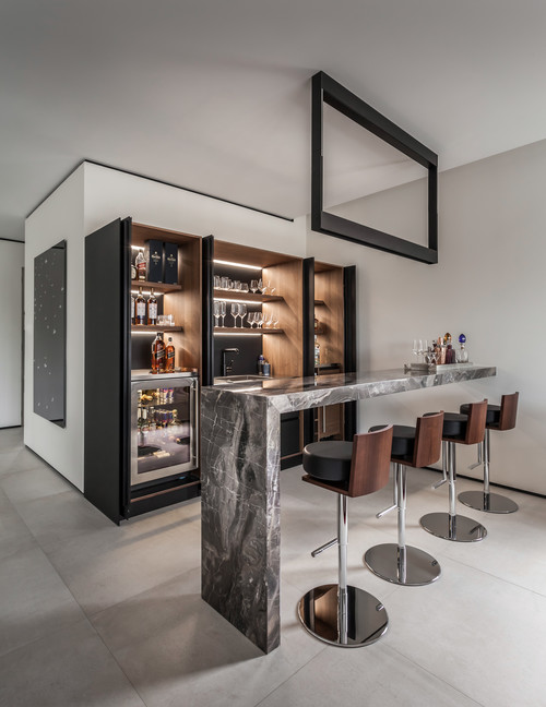 A beépített hűtő mellett a polcok és a világítás teszi egyedivé a látványt, a kényelemről pedig a méretes, vízeséses kialakítású gránitpult gondoskodik – utóbbi kellően széles ahhoz, hogy akár mindkét oldalról körülüljék a vendégek.