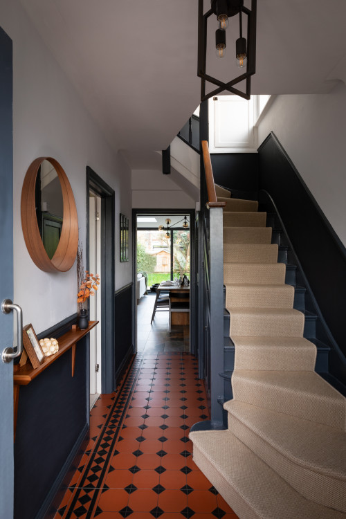 Ezt a londoni Edward-kori otthont Jo Kaur Llogarajah tervezte át a Studio JKL-től. Llogarajah az itt látható keskeny előszobában a meglévő padló merész színeire támaszkodott, és meleg fa elemeket és mélyszürke festéket adott hozzá, hogy kiegészítse a terrakotta-fekete csempéket. A falra akasztott polc egy diófa léc, de elég nagy ahhoz, hogy elférjenek rajta az alapvető dolgok, plusz egy-két dekoratív kiegészítő.