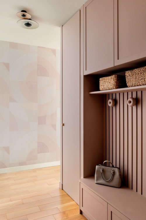 Az Esprit Gaïa által tervezett kis párizsi lakás előszobájában ez az egyedi tárolódarab rengeteg nyitott és zárt tárolóhelyet, valamint egy padot is biztosít, mindezt kis alapterületen. A szekrény Franciaországban gyártott, bioalapú kompozit fapanelekből készült, és környezetbarát lila festékkel festették le. A szintén francia gyártmányú Drugeot Manufacture Donut kabátkampók szövetbarát helyeket kínálnak a kabátok és kardigánok felakasztásához.