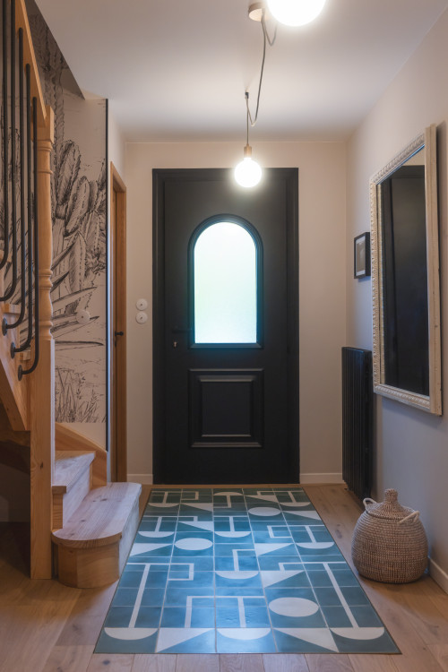 Ezt az 1970-es évekbeli délnyugat-franciaországi házat Alexandra Gorla építész tervezte át kívül-belül. A kettő közötti eklektikus átmeneti területen egy geometrikus, csempéből készült „térszőnyeg” illeszkedik a környező keményfához - tartós, kreatív és botlásmentes módja a belépési zóna elhatárolásának.