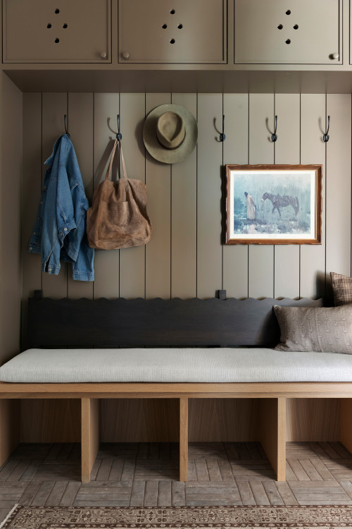 Laura Tays a Tays & Co. Design Studiostól ezt a hangulatos minneapolisi mosdószobát különleges részletekkel töltötte meg, például szellőzőnyílásokkal a felső szekrényekben és a diófából és fehér tölgyfából készült egyedi pad hátuljának recézett szélével. A megjelenés kedves, ugyanakkor munkára alkalmas is, tartós csempepadlóval és a pad párnáján lévő strapabíró szövetekkel.