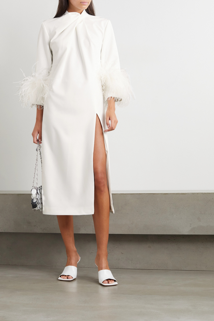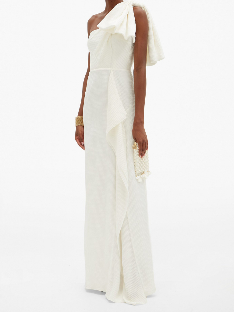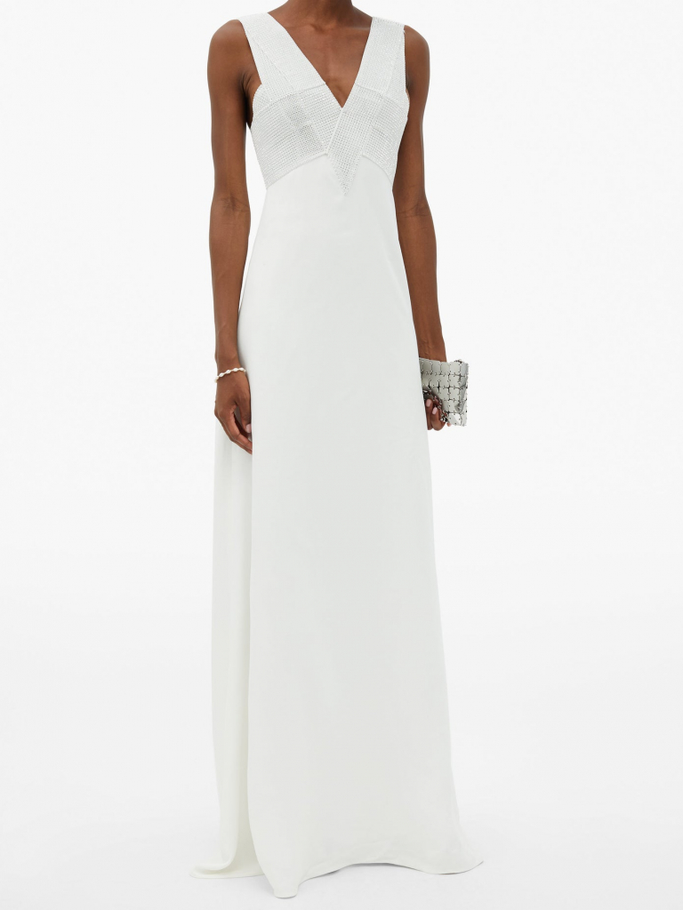 A Jacquemus ruha tulajdonképpen egy slip dress, csak esküvői változatban. A dekoltázsa nem csak a keresztben futó pánt miatt különleges, hanem az ejtett rész is extrává teszi. A két oldalt felsliccelt, térd alá érő ruha később is szuper társad lehet!