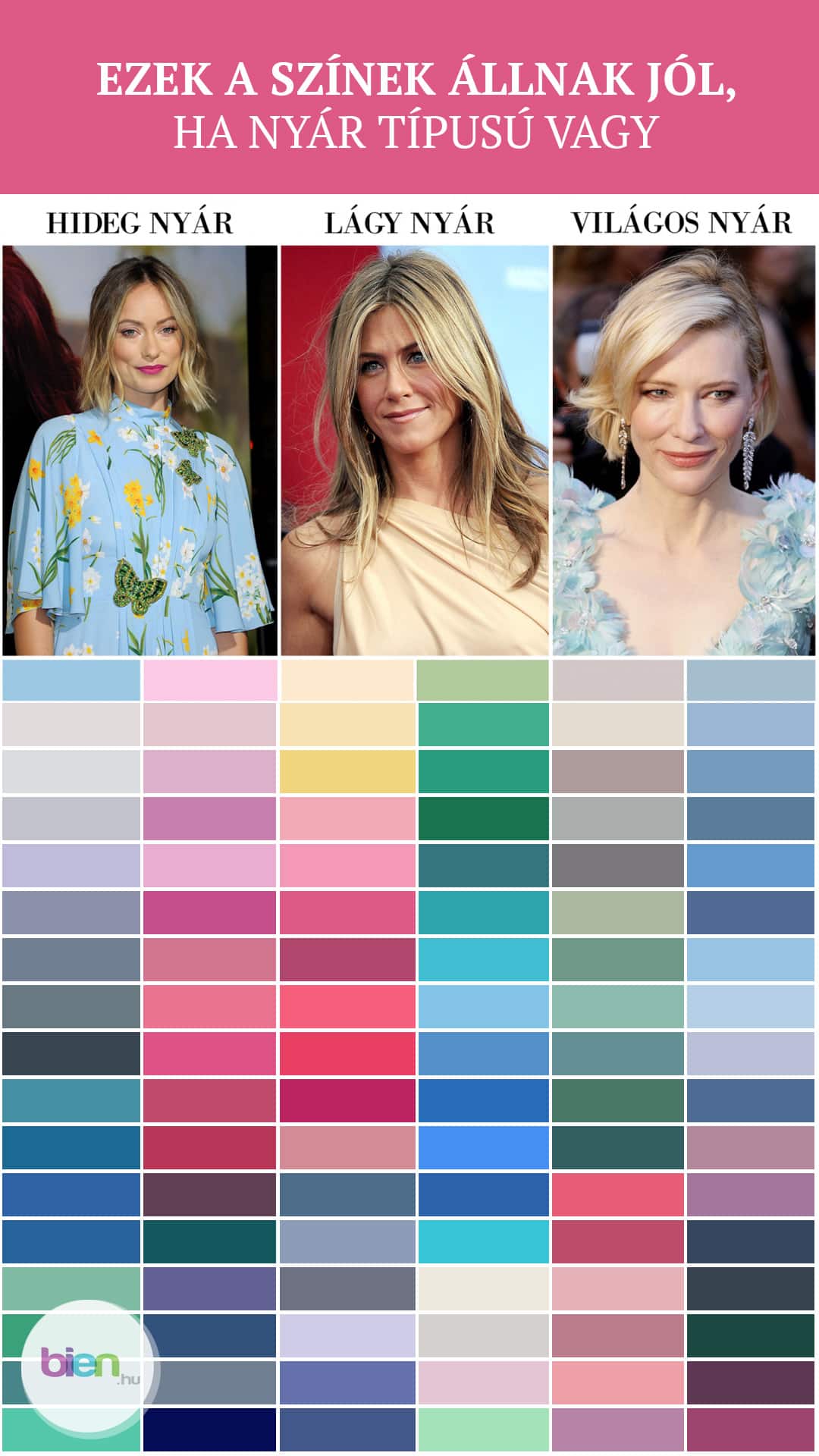 A nyár színpalettája a nagyon világos, hideg színekből áll. Ezen a típuson jól áll a tört, kevésbé élénk szín, melyek a többi típust inkább fáradttá, élettelenné teszik. A nyár típust, viszont ezek keltik életre és teszik igazán sugárzóvá.