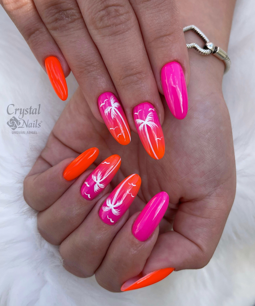 Rendkívül felkapottak lettek idén a krómporok, ezekkel nagyon egyszerűen készíthetünk feltűnő, metálos hatást, ami tökéletes a fesztiválszezonra. Kombinálhatjuk színátmenetekkel, nálam a szalonban most a narancs-pink kombó a favorit. Igazi naplementés, „Malibu sunrise” hangulatot érhetünk el vele. Ezt megbolondíthatjuk egy-egy pálmafával, és kész is az igazi nyaralós szett.