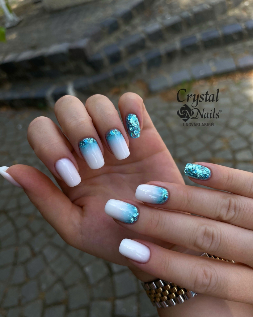 A glitter ombre körmök is töretlenül nagy népszerűségnek örvendenek, nem telik el nap a szalonban nélkülük. Bármilyen színű csillámmal készíthetjük, a végeredmény biztos, hogy bomba lesz. Ha igazán nyáriasra szeretnénk, próbáljuk ki a türkiz csillám – tejfehér zselé kombót.