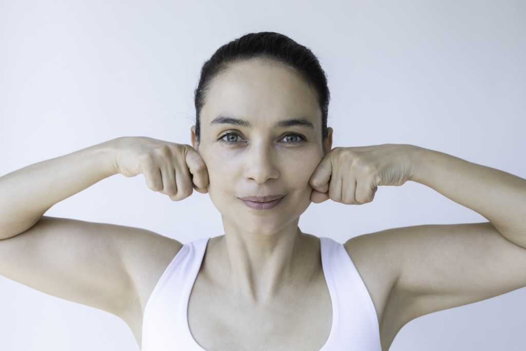 A második gyakorlathoz mosolyogjunk, de csak enyhén, mintha csak egy halvány mosolyt küldenénk a tükörképünknek. Ujjainkkal helyezzük el először a szánk sarkait, és gyengéden húzzuk vissza őket, érezve az enyhe húzást az arc középvonalán és a mosolyvonalain.