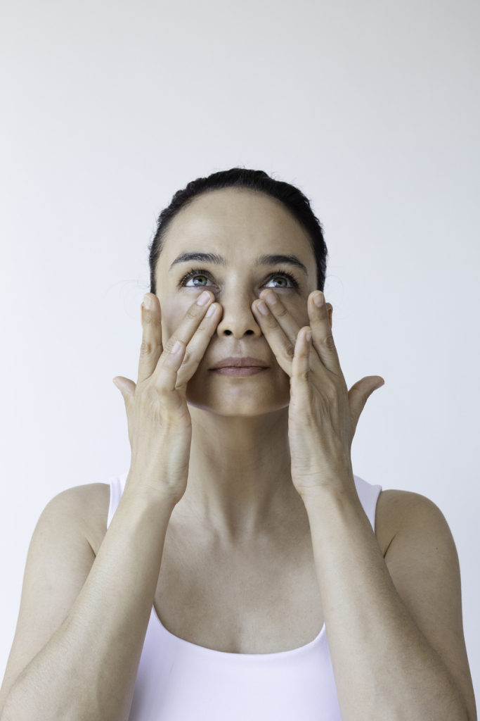 A szemkörnyék ápolása elengedhetetlen, különösen a reggeli órákban, amikor a fáradtság és a puffadtság gyakran megjelenik. Rögzítsünk két ujjat mindkét szem alá, enyhén megfeszítve a bőrt lefelé. Nézzünk fel, mintha az égen szeretnénk találni valamit, és próbáljuk meg fel-le mozgatni a szemhéjunkat erőltetés nélkül.