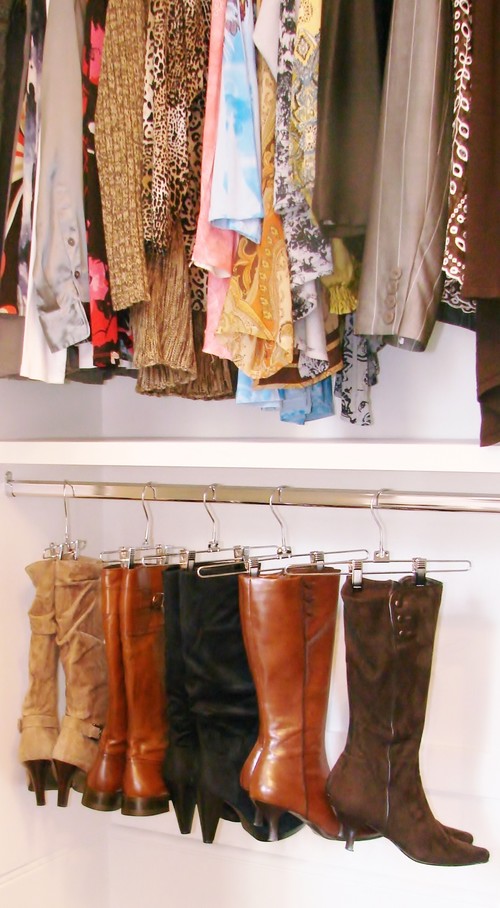 A mély műanyag tárolók a szezonon kívül öltözékeket rejtik, míg az akasztókon szín szerint rendszerezve lógnak szépen a ruhák. A csizmák tárolását is megoldhatod a gardróbban, egyszerű nadrág vállfák segítségével.
