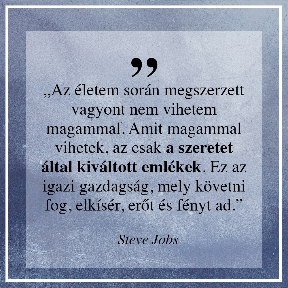 „Az életem során megszerzett vagyont nem vihetem magammal. Amit magammal vihetek, az csak a szeretet által kiváltott emlékek. Ez az igazi gazdagság, mely követni fog, elkísér, erőt és fényt ad.”