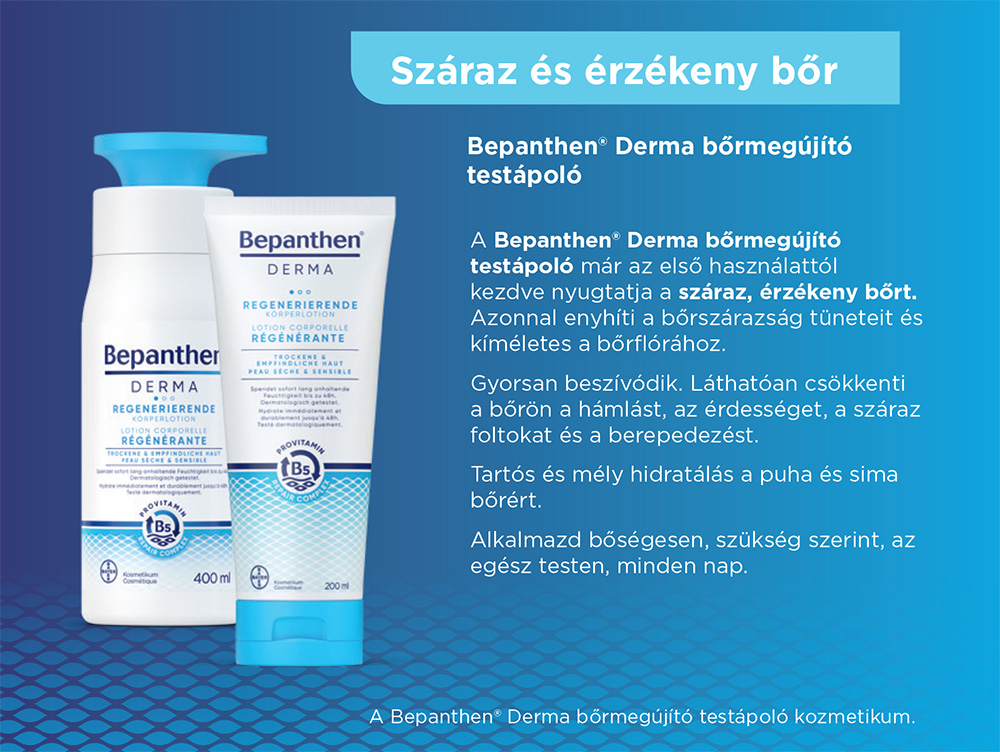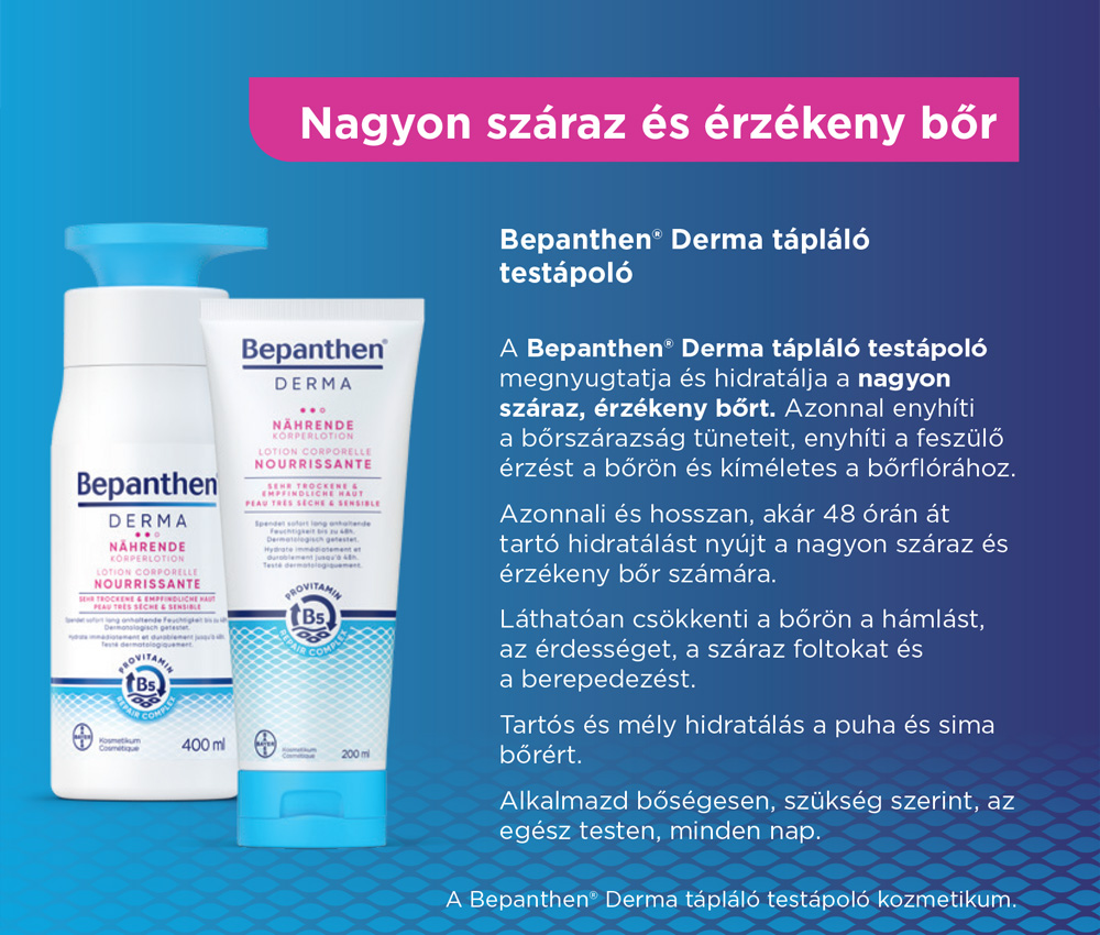A rendszeres, tápláló testápolás már néhány nap alatt érezhetően javíthat a komfortérzeteden: puhítja, rugalmassá és bársonyos tapintásúvá teszi a bőrödet. Próbáld ki a Bepanthen Derma Bőrmegújító testápolóját, amely azonnali és hosszan tartó hidratálást nyújt akár 48 órán át, miközben segíti a bőröd természetes regenerációját! Könnyű textúrája gyorsan beszívódik, így mindennapi használatra is ideális.