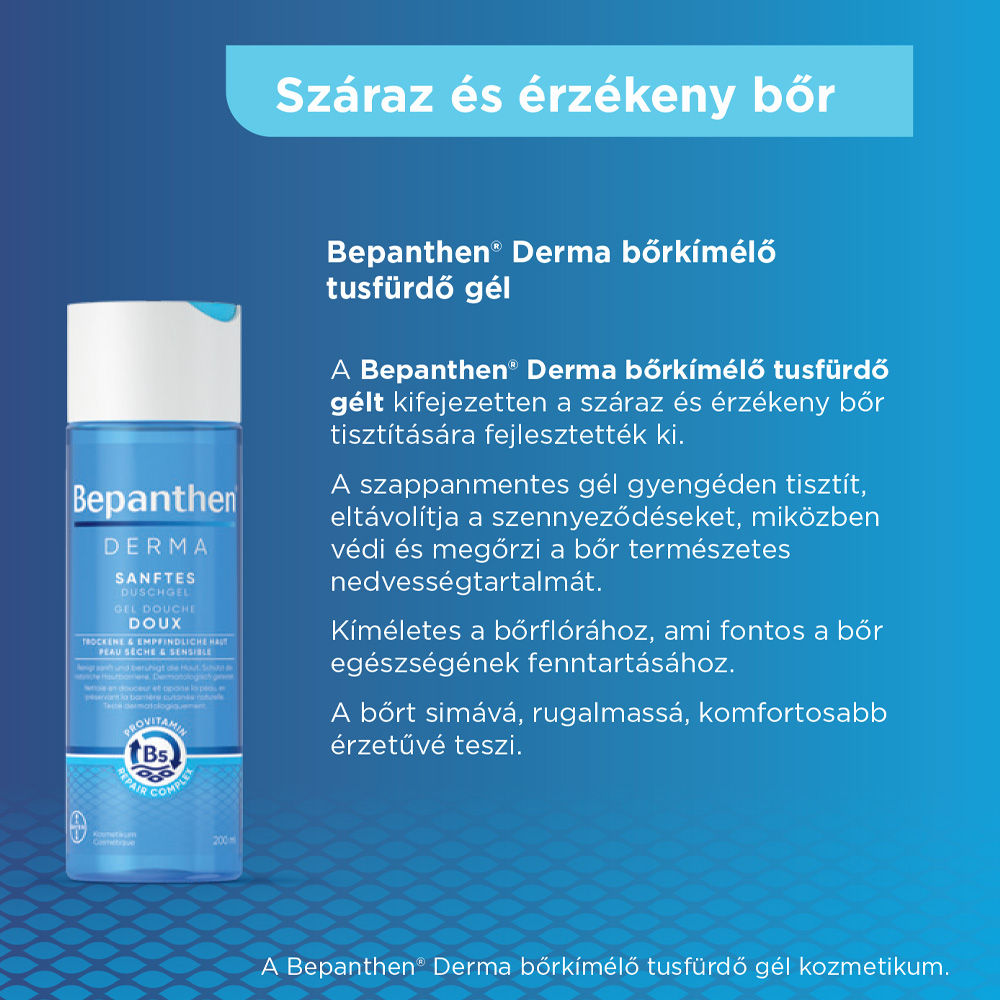Érdemes szappanmentes, bőrbarát pH-értékű formulát választanod, amely gyengéden eltávolítja a szennyeződéseket, miközben segít megőrizni bőröd védőrétegét és puhaságát. Próbáld ki a Bepanthen Derma Bőrkímélő tusfürdő gélt, amely már a zuhany alatt enyhíti a húzódó, feszülő érzést! Ez a kozmetikum alaposan, de a bőr természetes védőrétegének károsítása nélkül tisztít, miközben kíméletes a bőrflórához. Az egész család számára ideális választás!