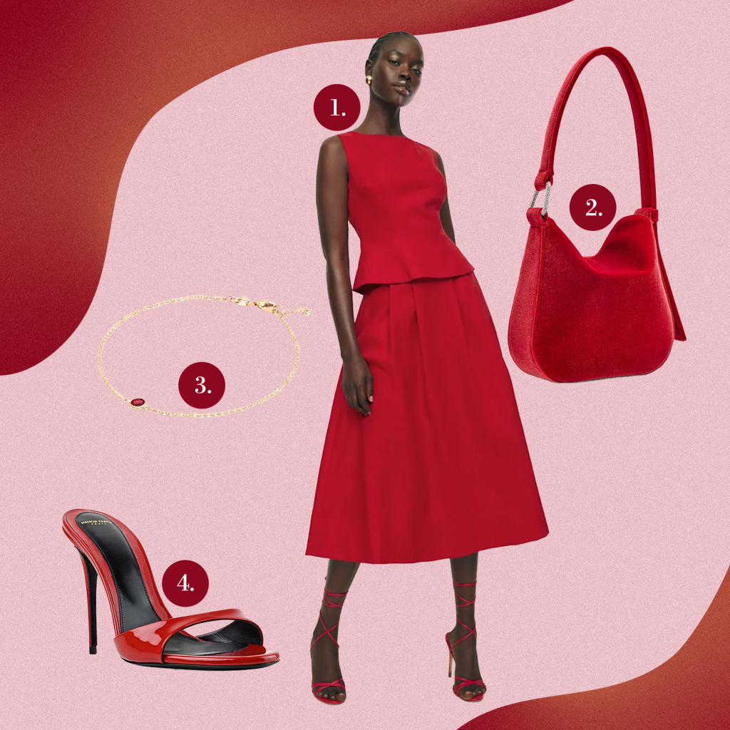 Ez a szett a Reformation-tól szépen emeli ki az alakot, egy testhez simuló felsőrésszel és A-vonalú szoknyával. Mivel egy olyan erőteljes szín dominál, ami azonnal magára vonja a figyelmet, a finom ékszerek, egyszerű magassarkú cipők és egy mini táska elegendőek ahhoz, hogy teljes legyen a szett. A különböző textúrák (például bársony, bőr és vászon) hozzáadásával egy kis dimenziót és változatosságot csempészhetsz a megjelenésedbe.