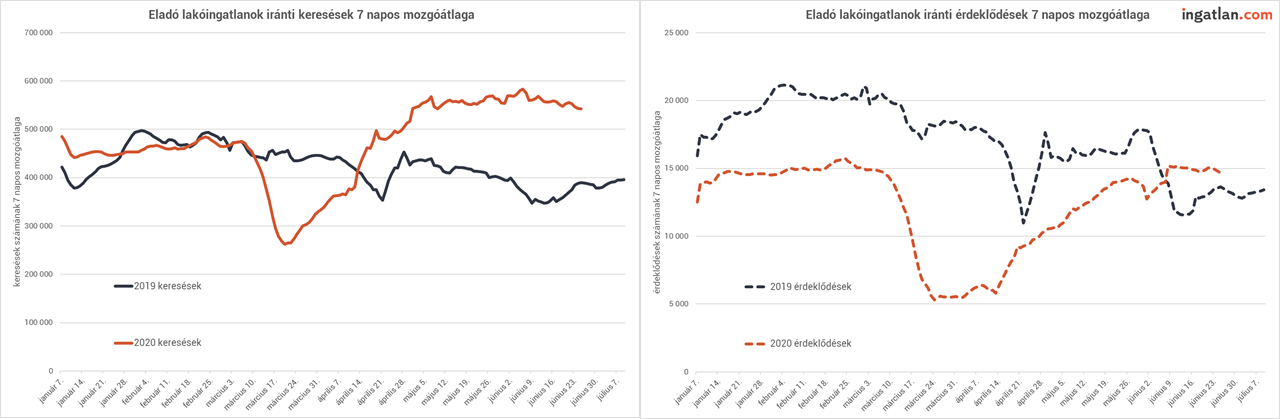 Az ingatlan.com oldalán a lakóingatlanokra iránti keresések júniusban már az előző évi szint másfélszeresére nőttek, ami szintén rekordot jelent. Az érdeklődések száma viszont csak a járvány előtti szintre kúszott vissza, bár ez is meghaladja a tavaly júniusi értéket.