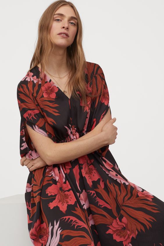 A vörös és fekete H&M kaftánruha enyhén fényes anyagú, lágy esésű, ezért a hőségben és a hűvösebb időben is szuper választás lehet!