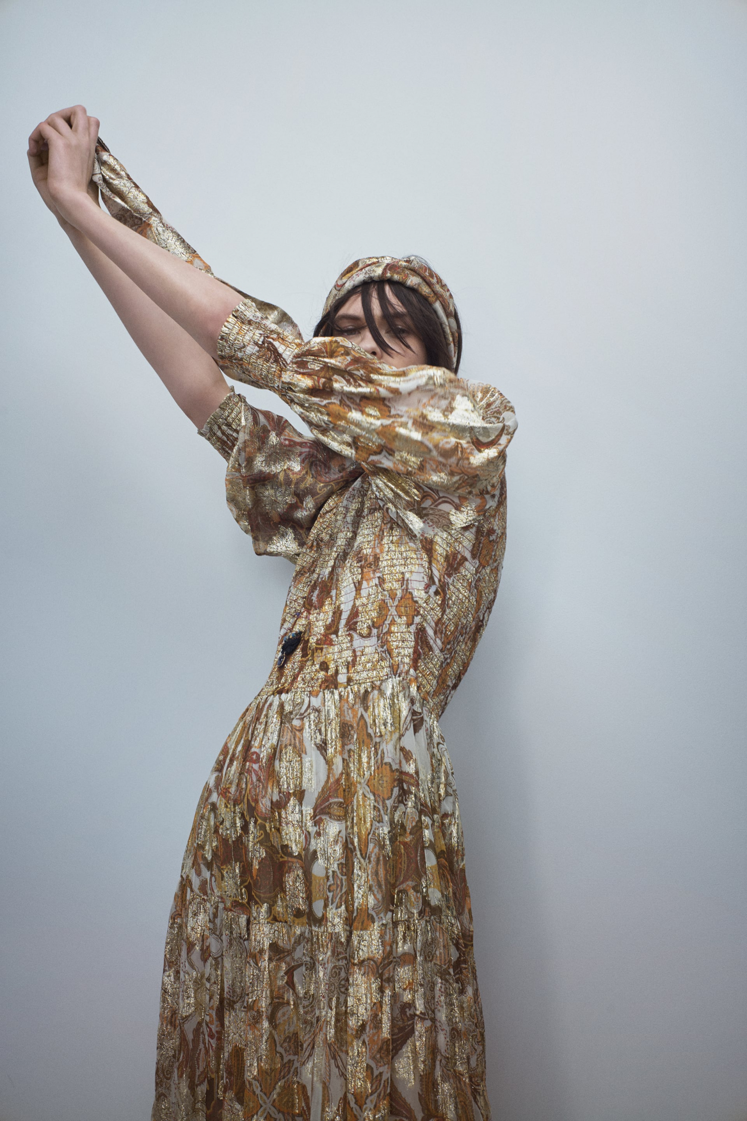 Ez a felül húzott, fémesen csillogó, puffos ujjú Zara ruha éppen annyira jól mutat nyáron egy csinos szandállal, mint ősszel egy barna csizmával.