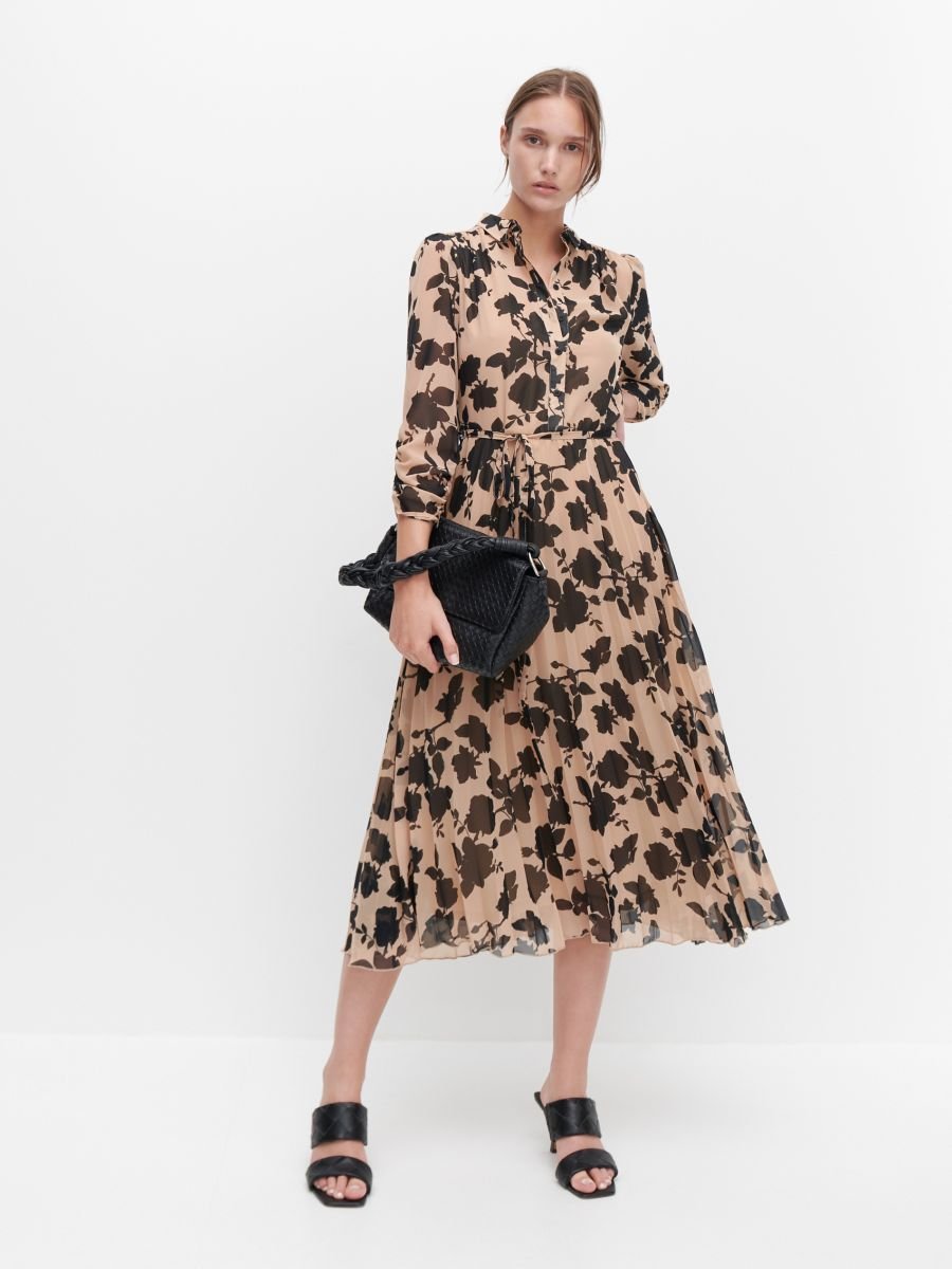 Ez a nude alapon fekete virágos midiruha remek választás elegánsabb alkalmakra is, hiszen visszafogott színű és könnyed anyagú.